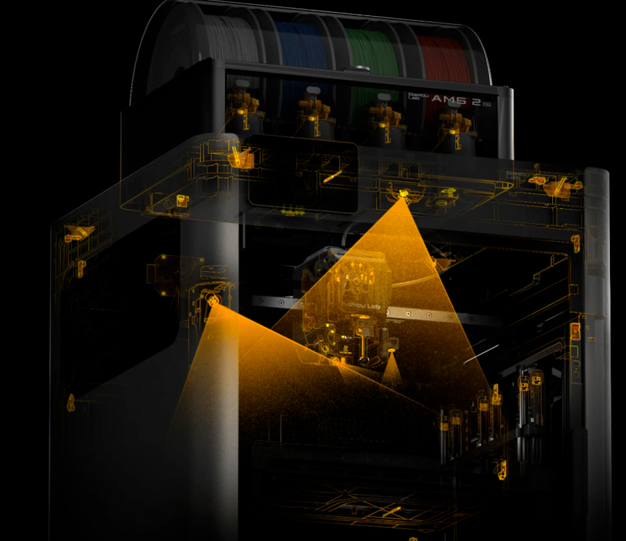 Принтер H2C оснащён комплексом из 59 датчиков и системой компьютерного зрения с четырьмя камерами, которыми управляет запатентованный нейросетевой алгоритм. Одна из ИИ-камер расположена непосредственно у сопла и оснащена макролинзой.  В процессе печати эта система обеспечивает интеллектуальную диагностику в реальном времени, способную обнаруживать даже самые незначительные аномалии прямо по ходу работы.
