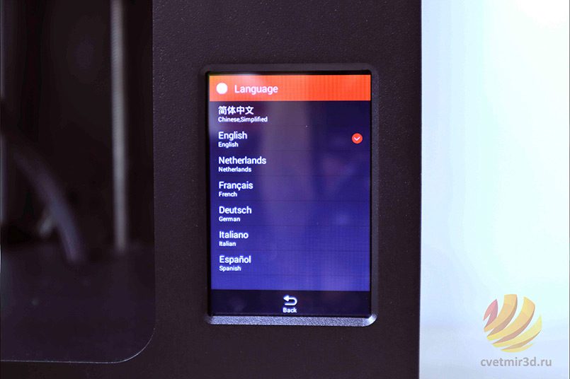 В нижних строках находятся меню выбора языка. Русского языка тут нет, но управлению принтером это нисколько не мешает. После него идёт раздел, посвящённый сопряжению принтера с мобильным приложением. Информации о нем не очень много, но производитель заявляет о возможности не только запускать печать с телефона, но и редактировать модели, размещать их в печатной зоне и нарезать на слои.