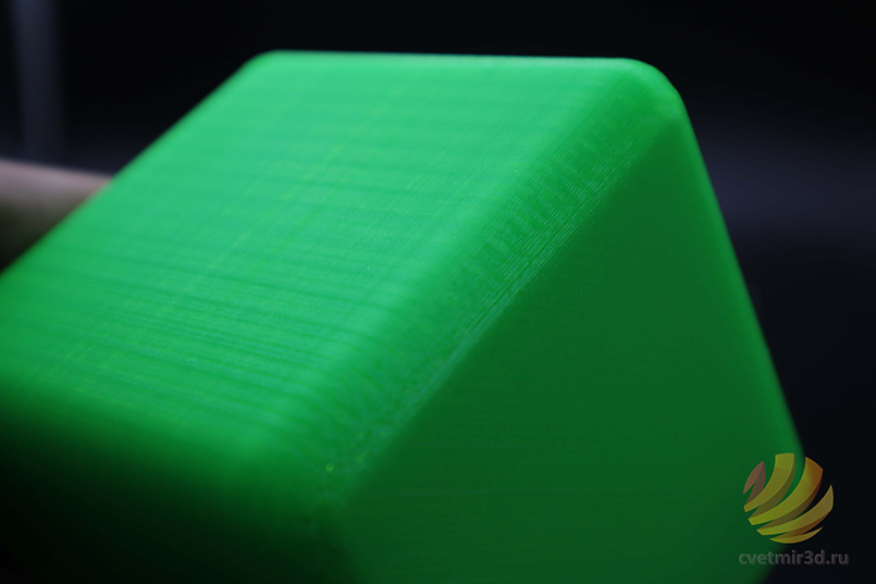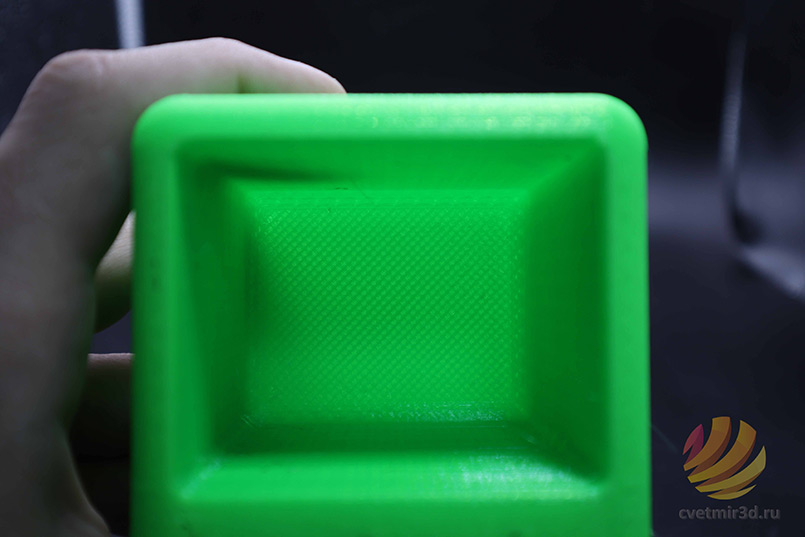 Как мы видим при закрытой камере Wanhao GR2 прекрасно печатает сложными пластиками. Толщина стенки этой модели всего 1,2 мм. Но её не повело, и не разорвало между слоями, что часто бывает на открытых принтерах. Взглянув на плоскость прилегания можно ещё раз убедиться, что она плотно прилипла к столу и не отрывалась. Из косяков можно отметить видимый шов на одном из углов модели, но его спокойной можно удалить при помощи любого инструмента. Такой результат вдохновил нас попробовать печатать на этом принтере чем-то посложнее ABS.