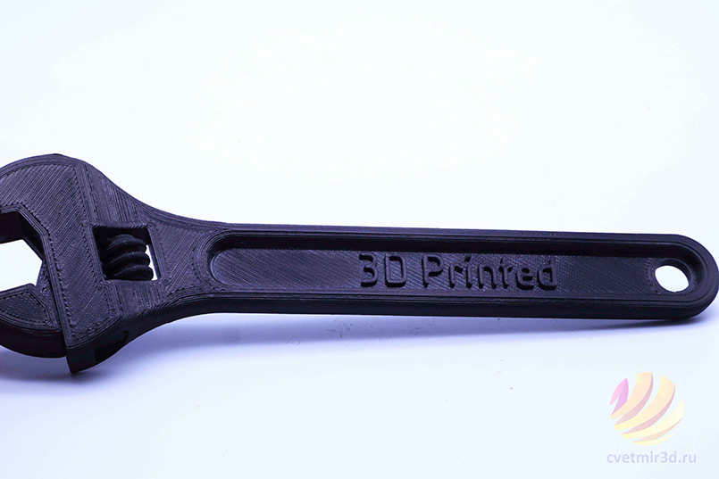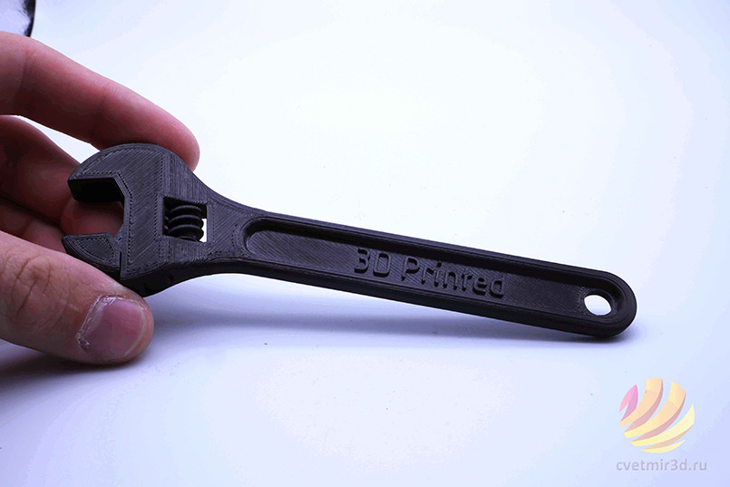 Моделька напечаталась без каких-либо проблем и после удаления поддержек сразу же закрутилась. Во время этой печати было очень много сложных участков, которые печатались на поддержках, но охлаждение отлично справилось с ними, позволив отделить поддержки руками. А точность принтера наглядно демонстрирует выпуклая надпись на ручке этого ключа.