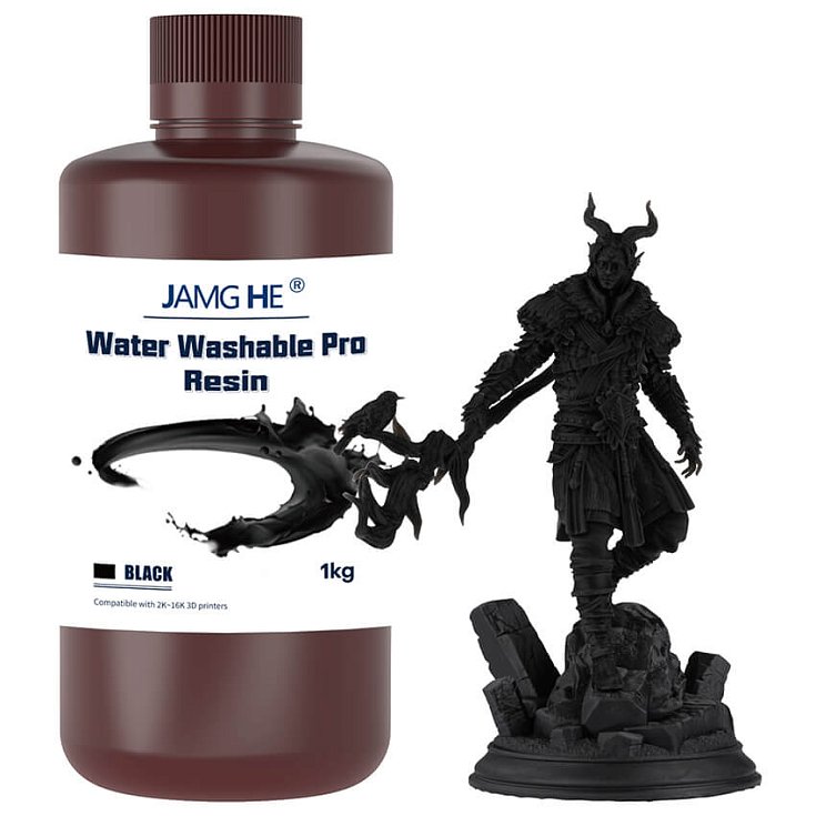 Фотополимерная смола Jamg He Water-Washable Pro UV Resin черного цвета представляет собой усовершенствованный материал для 3Д-печати, созданный на основе технологии водосмываемых полимеров.